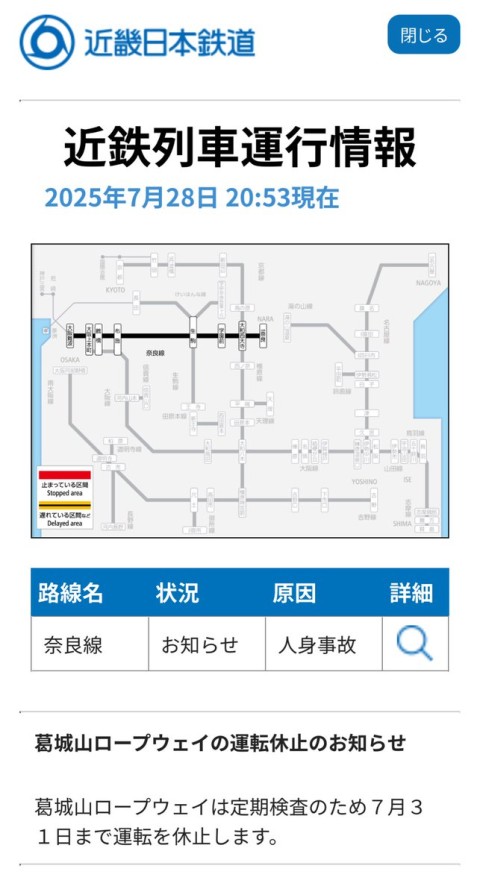 近鉄で奈良方面へお帰りのお客様、近鉄奈良線運航停止中です。