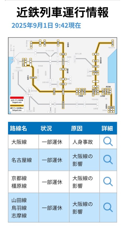 運転再開しましたが、ダイヤの乱れがでておりますので大阪線ご利用の方はお気をつけ下さいませ