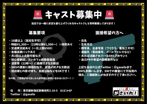 | 時給 | 20:00~00:00¥1200~¥1,500
