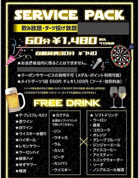 飲み放題&ダーツ投げ放題でおトク‼︎