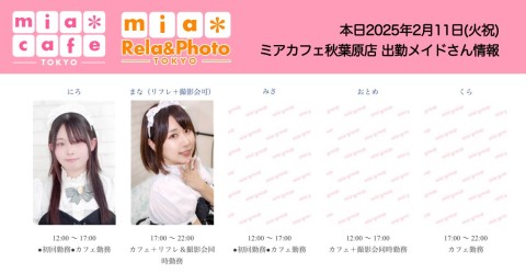 | 営業時間 | 12:00〜22:00(最終受付21:20) 定休日 不定休 深夜営業については、公式ページ右上の深夜営業日案内を ご覧ください(金曜・土曜日を中心に深夜営業予定)。 深夜営業対象日 22:00〜翌朝5:00(最終受付 翌朝4:20) http://market.chu.jp/schedule1/sche37.cgi ミアグループ総合スケジュール(PC&スマホ) http://market.chu.jp/schedule1/sche37.cgi?dm=1 ミアグループ総合スケジュール(ガラケー) 告知日のみ営業となります。告知日以外は深夜営業いたしておりません。 | ||||||||||||||