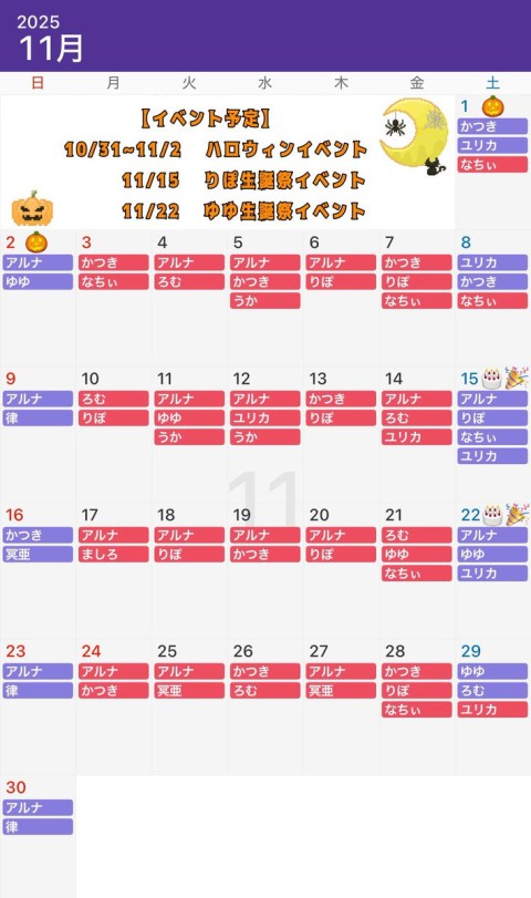 #Bar黒月 11月お給仕予定表🐈‍⬛ 【イベント予定】 1日(土)ハロウィンイベ🎃 2日(日)ハロウィンイベ🎃 15日(土)りぽ生誕祭🎀🍥 22日(土)ゆゆ生誕祭🍙🎀 11月より営業時間に一部変更があります。 詳しくは下記確認ください💫 営業時間 ❤️19時~23時 💜18時~23時 金・土・祝前日 https://t.co/gYvA6cP4C4