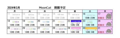 | å¶æ¥æé | å¶æ¥æé å¹³æ¥ãæãæšã20ïŒ00ãæ·±å€2ïŒ00 ããŒãã»ããªã³ã¯ã»ã«ã©ãªã± ã©ã¹ããªãŒããŒïŒ1ïŒ30 鱿«ã»éåã»ç¥åæ¥ã20ïŒ00ãæ·±å€5ïŒ00 ããŒãã»ããªã³ã¯ã»ã«ã©ãªã± ã©ã¹ããªãŒããŒïŒ4ïŒ30 å®äŒæ¥ æ¥ææ¥ â»ãã®ä»ã®èšæåºäŒæ¥ã¯ãtwitterã»HPã«ãŠãæ¡å ããŠãããŸãã ã·ã¹ãã MoonCatäžæŽ²åºã¯ã¿ã€ã ãã£ãŒãžå¶ã§ãã ïŒãäž»äººæ§ ã»æåã®60åãã900å ã»ä»¥é30忝ãã600å ïŒãå¬¢æ§ ããã£ãŒãžæç¡æ ã»ãäžäººæ§ã«ã€ãæåã«ã¯ã³ãªãŒããŒãããã ããŠãããŸãã ãæ³šæãã䌺ãããŠããã®æéå¶ãšãªããŸãã ã»ïŒïŒæ³æªæºã®æ¹ã¯ã22æä»¥éã®ãæ¥åºã¯åºæ¥ãŸããã ã»é転è ã®æ¹ã¯ã飲é ããé æ ®ããã ããŠãããŸãã | ||||||||||||||
