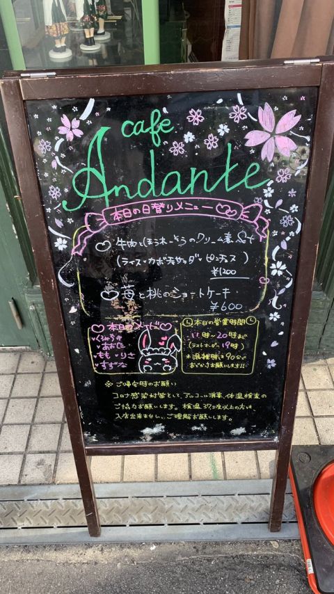 | 営業時間 | 平日15時〜22時。土日祝12時〜22時。不定期で営業時間が変わる場合がございます。詳しくは下記スケジュール表をご確認下さいhttp://andante.jp/ftschedule221/schedule.cgi | ||||||||||||||