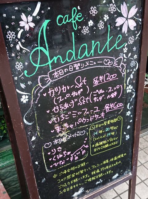 | 営業時間 | 平日15時〜22時。土日祝12時〜22時。不定期で営業時間が変わる場合がございます。詳しくは下記スケジュール表をご確認下さいhttp://andante.jp/ftschedule221/schedule.cgi | ||||||||||||||