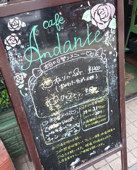 | 営業時間 | 平日15時〜22時。土日祝12時〜22時。不定期で営業時間が変わる場合がございます。詳しくは下記スケジュール表をご確認下さいhttp://andante.jp/ftschedule221/schedule.cgi | ||||||||||||||