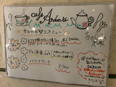 | 営業時間 | 平日15時〜22時。土日祝12時〜22時。不定期で営業時間が変わる場合がございます。詳しくは下記スケジュール表をご確認下さいhttp://andante.jp/ftschedule221/schedule.cgi | ||||||||||||||