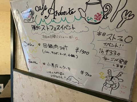 | 営業時間 | 平日15時〜22時。土日祝12時〜22時。不定期で営業時間が変わる場合がございます。詳しくは下記スケジュール表をご確認下さいhttp://andante.jp/ftschedule221/schedule.cgi | ||||||||||||||