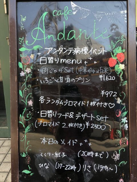 | 営業時間 | 平日15時〜22時。土日祝12時〜22時。不定期で営業時間が変わる場合がございます。詳しくは下記スケジュール表をご確認下さいhttp://andante.jp/ftschedule221/schedule.cgi | ||||||||||||||