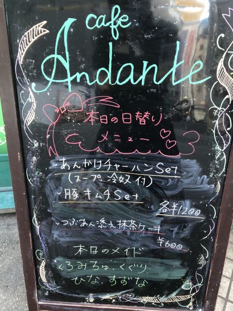 | 営業時間 | 平日15時〜22時。土日祝12時〜22時。不定期で営業時間が変わる場合がございます。詳しくは下記スケジュール表をご確認下さいhttp://andante.jp/ftschedule221/schedule.cgi | ||||||||||||||