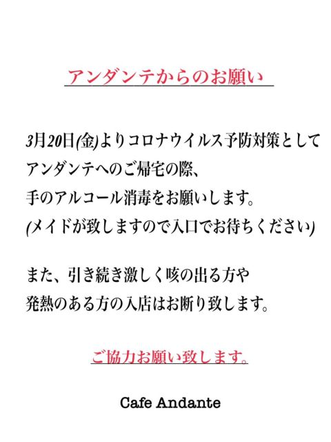 | 営業時間 | 平日15時〜22時。土日祝12時〜22時。不定期で営業時間が変わる場合がございます。詳しくは下記スケジュール表をご確認下さいhttp://andante.jp/ftschedule221/schedule.cgi | ||||||||||||||
