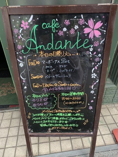 | 営業時間 | 平日15時〜22時。土日祝12時〜22時。不定期で営業時間が変わる場合がございます。詳しくは下記スケジュール表をご確認下さいhttp://andante.jp/ftschedule221/schedule.cgi | ||||||||||||||