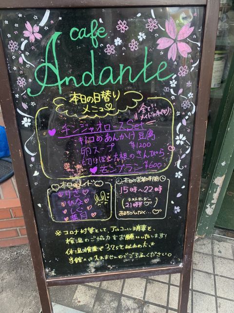| 営業時間 | 平日15時〜22時。土日祝12時〜22時。不定期で営業時間が変わる場合がございます。詳しくは下記スケジュール表をご確認下さいhttp://andante.jp/ftschedule221/schedule.cgi | ||||||||||||||