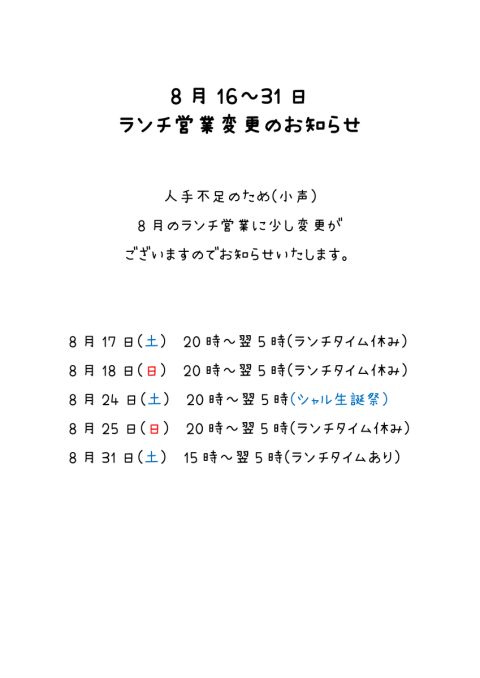 8月のランチ営業日はお休みが続きます、申し訳ございませんm(_ _)m