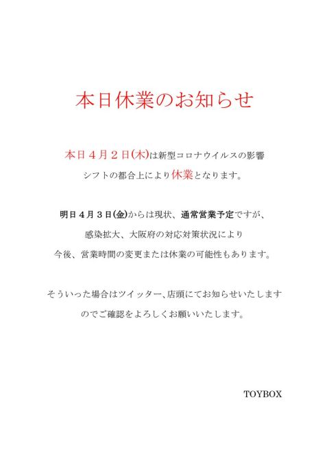 【本日4月2日(木)、休業のお知らせ】 https://t.co/3azxC1jCtJ