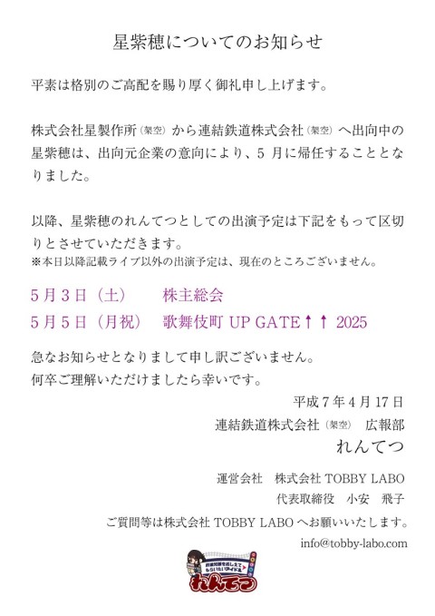 星紫穂 @shippon320 、株式会社星製作所へ帰任のお知らせです。急なお知らせで申し訳ございません。 https://t.co/Ps2B3eXIKS