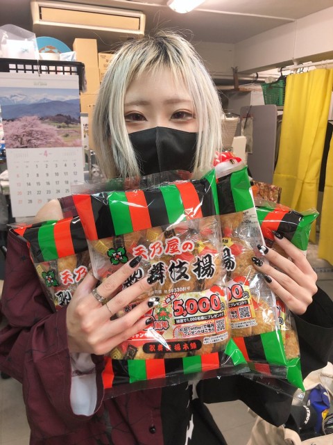 はやぶさちゃん@hayab1115 がれんてつかふぇのお通しの歌舞伎揚たくさん買ってきてくれたよ〜!!