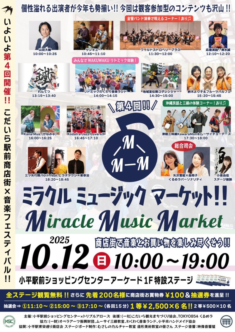 @jam 10/12日『ミラクルミュヌゞックマヌケット(MMM)』 📍小平駅前ショッピングセンタヌ アヌケヌド1F特蚭ステヌゞ ⏰10:00〜19:00 🕊芳芧無料🕊 🎀13:15-13:40 📞出挔終了埌1時間皋床しょうざえもん様店内を利甚させお頂きたす フラむダヌ蚘茉の店舗様で買ったもののみ差し入れOK https://t.co/0hloPo9XZj