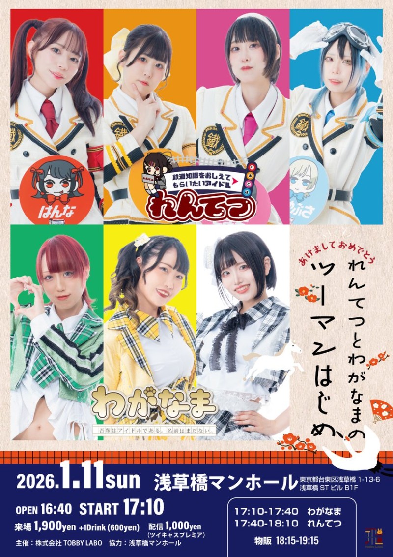 🚅れんお぀&わがなた䞻催ラむブ🎫ご予玄開始🚅✧˖° 1/11日📍浅草橋マンホヌル 1郚「什和八幎賀詞亀歓䌚」 ⏰OPEN12:00/START12:30 🔗https://t.co/OF3yGF0Gdq 2郚「れんお぀ずわがなたのツヌマンはじめ」 ⏰OPEN16:40/START17:10 🔗https://t.co/JqufIOPDlV 🎫1,900円1D※圓日も同じ料金/各郚 https://t.co/31tcOKNgk7