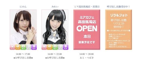| å¶æ¥æé | âãã¢ã«ãã§æ±äº¬åºïŒã¡ã€ãã«ãã§ïŒhttp://www.mia-cafe.com/ãâ â¡å¹³æ¥ãæïœéãïŒïŒïŒïŒïŒïœïŒïŒïŒïŒïŒ â¡åæã»æ¥æã»ç¥æ¥ãïŒïŒïŒïŒïŒïœïŒïŒïŒïŒïŒ â å®äŒæ¥ããªãïŒ2019幎1æããå®äŒæ¥å»æ¢ïŒ â¡ã©ã¹ããªãŒããŒãéåºã®ïŒïŒåå ãïŒïŒïŒïŒïŒéåºã®å ŽåâïŒïŒïŒïŒïŒã©ã¹ããªãŒããŒ å¶æ¥æ¥ãåºå€ç¶æ³ã«ã€ããŠã¯ãã¡ãã http://pandaland.cutegirl.jp/mif/c_cms_csv/sch_top.php âãã¢ãªã©ïŒãã©ãæ±äº¬åºïŒæ®åœ±äŒïŒãªãã¬ïŒhttp://www.mif-lr.com/ãâ â¡å šæ¥ãïŒïŒïŒïŒïŒãïŒïŒïŒïŒïŒãã§ãããªã©ã¯ãŒãŒã·ã§ã³åºå€ã¹ã¿ãããããæé垯ã®ã¿å¶æ¥ã§ãã â å®äŒæ¥ã¯äžå®äŒïŒåºå€ã¹ã¿ãããããæé垯ã®å¶æ¥ïŒ â¡æçµåä»ãéåºã®ïŒïŒåå ãïŒïŒïŒïŒïŒéåºã®å ŽåâïŒïŒïŒïŒïŒïŒïŒïŒïŒïŒïŒè¿ã«æœè¡æéãçµããã³ãŒã¹ïŒ â»é«æ ¡çäžå¯ âæ·±å€å¶æ¥ã«ã€ããŠã¯ãå ¬åŒãµã€ãå³äžã® http://market.chu.jp/schedule1/sche37.cgi ãã¢ã°ã«ãŒãç·åã¹ã±ãžã¥ãŒã«ïŒïŒ°ïŒ£ã»ã¹ããïŒ http://market.chu.jp/schedule1/sche37.cgi?dm=1 ãã¢ã°ã«ãŒãç·åã¹ã±ãžã¥ãŒã«ïŒã¬ã©æºåž¯ïŒ ãã芧ãã ãããåç¥æ¥ã®ã¿å¶æ¥ãšãªããŸããåç¥æ¥ä»¥å€ã¯æ·±å€å¶æ¥ããããŠãããŸããã æ·±å€å¶æ¥å¯Ÿè±¡æ¥ãïŒïŒïŒïŒïŒãç¿æïŒïŒïŒïŒïŒïŒ¬ïŒïŒ¯ïŒïŒïŒïŒïŒïŒ | ||||||||||||||