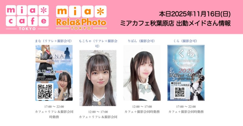| å¶æ¥æé | âãã¢ã«ãã§æ±äº¬åºïŒã¡ã€ãã«ãã§ïŒhttp://www.mia-cafe.com/ãâ â¡å¹³æ¥ãæïœéãïŒïŒïŒïŒïŒïœïŒïŒïŒïŒïŒ â¡åæã»æ¥æã»ç¥æ¥ãïŒïŒïŒïŒïŒïœïŒïŒïŒïŒïŒ â å®äŒæ¥ããªãïŒ2019幎1æããå®äŒæ¥å»æ¢ïŒ â¡ã©ã¹ããªãŒããŒãéåºã®ïŒïŒåå ãïŒïŒïŒïŒïŒéåºã®å ŽåâïŒïŒïŒïŒïŒã©ã¹ããªãŒããŒ å¶æ¥æ¥ãåºå€ç¶æ³ã«ã€ããŠã¯ãã¡ãã http://pandaland.cutegirl.jp/mif/c_cms_csv/sch_top.php âãã¢ãªã©ïŒãã©ãæ±äº¬åºïŒæ®åœ±äŒïŒãªãã¬ïŒhttp://www.mif-lr.com/ãâ â¡å šæ¥ãïŒïŒïŒïŒïŒãïŒïŒïŒïŒïŒãã§ãããªã©ã¯ãŒãŒã·ã§ã³åºå€ã¹ã¿ãããããæé垯ã®ã¿å¶æ¥ã§ãã â å®äŒæ¥ã¯äžå®äŒïŒåºå€ã¹ã¿ãããããæé垯ã®å¶æ¥ïŒ â¡æçµåä»ãéåºã®ïŒïŒåå ãïŒïŒïŒïŒïŒéåºã®å ŽåâïŒïŒïŒïŒïŒïŒïŒïŒïŒïŒïŒè¿ã«æœè¡æéãçµããã³ãŒã¹ïŒ â»é«æ ¡çäžå¯ âæ·±å€å¶æ¥ã«ã€ããŠã¯ãå ¬åŒãµã€ãå³äžã® http://market.chu.jp/schedule1/sche37.cgi ãã¢ã°ã«ãŒãç·åã¹ã±ãžã¥ãŒã«ïŒïŒ°ïŒ£ã»ã¹ããïŒ http://market.chu.jp/schedule1/sche37.cgi?dm=1 ãã¢ã°ã«ãŒãç·åã¹ã±ãžã¥ãŒã«ïŒã¬ã©æºåž¯ïŒ ãã芧ãã ãããåç¥æ¥ã®ã¿å¶æ¥ãšãªããŸããåç¥æ¥ä»¥å€ã¯æ·±å€å¶æ¥ããããŠãããŸããã æ·±å€å¶æ¥å¯Ÿè±¡æ¥ãïŒïŒïŒïŒïŒãç¿æïŒïŒïŒïŒïŒïŒ¬ïŒïŒ¯ïŒïŒïŒïŒïŒïŒ | ||||||||||||||