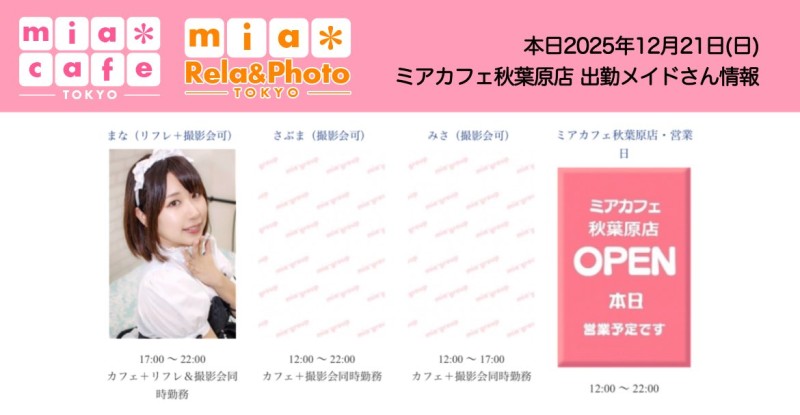 | å¶æ¥æé | âãã¢ã«ãã§æ±äº¬åºïŒã¡ã€ãã«ãã§ïŒhttp://www.mia-cafe.com/ãâ â¡å¹³æ¥ãæïœéãïŒïŒïŒïŒïŒïœïŒïŒïŒïŒïŒ â¡åæã»æ¥æã»ç¥æ¥ãïŒïŒïŒïŒïŒïœïŒïŒïŒïŒïŒ â å®äŒæ¥ããªãïŒ2019幎1æããå®äŒæ¥å»æ¢ïŒ â¡ã©ã¹ããªãŒããŒãéåºã®ïŒïŒåå ãïŒïŒïŒïŒïŒéåºã®å ŽåâïŒïŒïŒïŒïŒã©ã¹ããªãŒããŒ å¶æ¥æ¥ãåºå€ç¶æ³ã«ã€ããŠã¯ãã¡ãã http://pandaland.cutegirl.jp/mif/c_cms_csv/sch_top.php âãã¢ãªã©ïŒãã©ãæ±äº¬åºïŒæ®åœ±äŒïŒãªãã¬ïŒhttp://www.mif-lr.com/ãâ â¡å šæ¥ãïŒïŒïŒïŒïŒãïŒïŒïŒïŒïŒãã§ãããªã©ã¯ãŒãŒã·ã§ã³åºå€ã¹ã¿ãããããæé垯ã®ã¿å¶æ¥ã§ãã â å®äŒæ¥ã¯äžå®äŒïŒåºå€ã¹ã¿ãããããæé垯ã®å¶æ¥ïŒ â¡æçµåä»ãéåºã®ïŒïŒåå ãïŒïŒïŒïŒïŒéåºã®å ŽåâïŒïŒïŒïŒïŒïŒïŒïŒïŒïŒïŒè¿ã«æœè¡æéãçµããã³ãŒã¹ïŒ â»é«æ ¡çäžå¯ âæ·±å€å¶æ¥ã«ã€ããŠã¯ãå ¬åŒãµã€ãå³äžã® http://market.chu.jp/schedule1/sche37.cgi ãã¢ã°ã«ãŒãç·åã¹ã±ãžã¥ãŒã«ïŒïŒ°ïŒ£ã»ã¹ããïŒ http://market.chu.jp/schedule1/sche37.cgi?dm=1 ãã¢ã°ã«ãŒãç·åã¹ã±ãžã¥ãŒã«ïŒã¬ã©æºåž¯ïŒ ãã芧ãã ãããåç¥æ¥ã®ã¿å¶æ¥ãšãªããŸããåç¥æ¥ä»¥å€ã¯æ·±å€å¶æ¥ããããŠãããŸããã æ·±å€å¶æ¥å¯Ÿè±¡æ¥ãïŒïŒïŒïŒïŒãç¿æïŒïŒïŒïŒïŒïŒ¬ïŒïŒ¯ïŒïŒïŒïŒïŒïŒ | ||||||||||||||