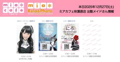 | å¶æ¥æé | âãã¢ã«ãã§æ±äº¬åºïŒã¡ã€ãã«ãã§ïŒhttp://www.mia-cafe.com/ãâ â¡å¹³æ¥ãæïœéãïŒïŒïŒïŒïŒïœïŒïŒïŒïŒïŒ â¡åæã»æ¥æã»ç¥æ¥ãïŒïŒïŒïŒïŒïœïŒïŒïŒïŒïŒ â å®äŒæ¥ããªãïŒ2019幎1æããå®äŒæ¥å»æ¢ïŒ â¡ã©ã¹ããªãŒããŒãéåºã®ïŒïŒåå ãïŒïŒïŒïŒïŒéåºã®å ŽåâïŒïŒïŒïŒïŒã©ã¹ããªãŒããŒ å¶æ¥æ¥ãåºå€ç¶æ³ã«ã€ããŠã¯ãã¡ãã http://pandaland.cutegirl.jp/mif/c_cms_csv/sch_top.php âãã¢ãªã©ïŒãã©ãæ±äº¬åºïŒæ®åœ±äŒïŒãªãã¬ïŒhttp://www.mif-lr.com/ãâ â¡å šæ¥ãïŒïŒïŒïŒïŒãïŒïŒïŒïŒïŒãã§ãããªã©ã¯ãŒãŒã·ã§ã³åºå€ã¹ã¿ãããããæé垯ã®ã¿å¶æ¥ã§ãã â å®äŒæ¥ã¯äžå®äŒïŒåºå€ã¹ã¿ãããããæé垯ã®å¶æ¥ïŒ â¡æçµåä»ãéåºã®ïŒïŒåå ãïŒïŒïŒïŒïŒéåºã®å ŽåâïŒïŒïŒïŒïŒïŒïŒïŒïŒïŒïŒè¿ã«æœè¡æéãçµããã³ãŒã¹ïŒ â»é«æ ¡çäžå¯ âæ·±å€å¶æ¥ã«ã€ããŠã¯ãå ¬åŒãµã€ãå³äžã® http://market.chu.jp/schedule1/sche37.cgi ãã¢ã°ã«ãŒãç·åã¹ã±ãžã¥ãŒã«ïŒïŒ°ïŒ£ã»ã¹ããïŒ http://market.chu.jp/schedule1/sche37.cgi?dm=1 ãã¢ã°ã«ãŒãç·åã¹ã±ãžã¥ãŒã«ïŒã¬ã©æºåž¯ïŒ ãã芧ãã ãããåç¥æ¥ã®ã¿å¶æ¥ãšãªããŸããåç¥æ¥ä»¥å€ã¯æ·±å€å¶æ¥ããããŠãããŸããã æ·±å€å¶æ¥å¯Ÿè±¡æ¥ãïŒïŒïŒïŒïŒãç¿æïŒïŒïŒïŒïŒïŒ¬ïŒïŒ¯ïŒïŒïŒïŒïŒïŒ | ||||||||||||||