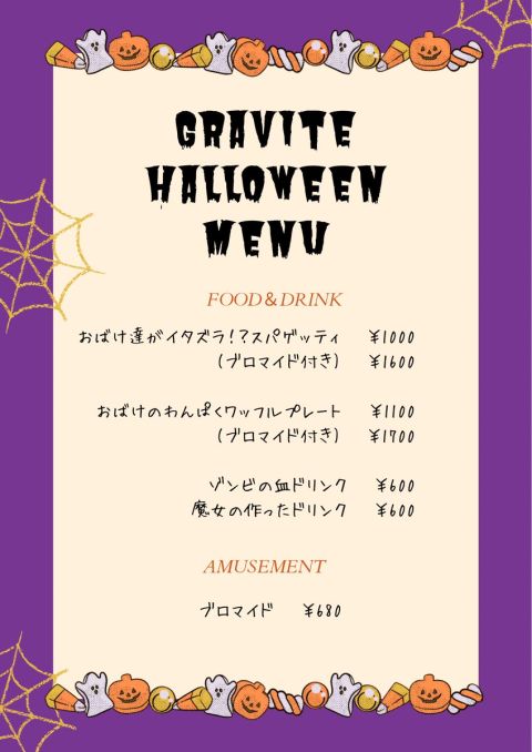 今週末のハロウィンイベント🎃特別メニューです! 皆各々の仮装をするらしいですよ〜(>ᴗ<) 可愛いフードとドリンクもお楽しみに❣️ #ハロウィン #グラヴィーテ #メイド喫茶 #メイドカフェ #コンカフェ #浜松 #とよ https://t.co/pjgO5v7Wm9