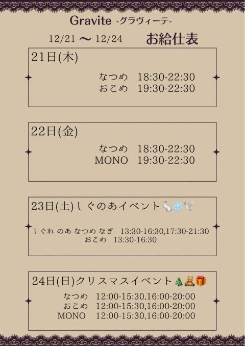今週はしぐのあイベントとクリスマスイベント!楽しい週末になりそうですね💕