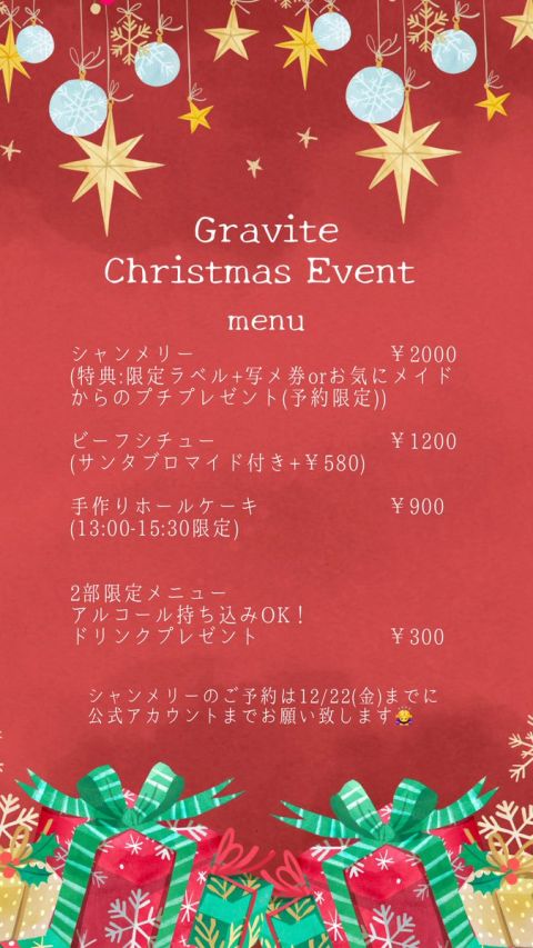 Graviteクリスマスイベントのお知らせです🎄🧸🎁︎ ̖́- シャンメリー特典のメイドプチプレゼントはプレゼント交換に使うも良し❕です⛄️ 1部は楽しいケーキパーティ、2部はオトナな飲み放題♥️ 楽しいクリスマス!ご帰宅お待ちしておりますっ🎅 #グラヴィーテ #クリスマス #コンカフェ #浜松 #メイド https://t.co/BvPa0ypXYr