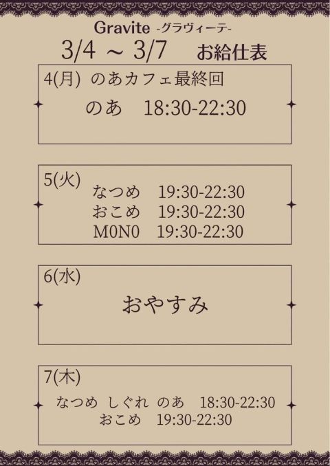 グラヴィーテ閉店イベント開催決定🥂𓈒𓏸︎︎︎︎ 日程…3/8(金)3/9(土)3/10(日) また、閉店イベントまでのイベント日程も以下の通りです🫧 閉店まで残り少なくなってきましたが、これからもグラヴィーテをよろしくお願いします✨✨ #グラヴィーテ #浜松 #メイド喫茶 #メイドカフェ #コンカフェ https://t.co/5vcr3AX3DL