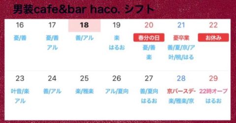 | 営業時間 | 20:00~翌5:00 ※コロナウイルスの影響で営業時間を変更しております。 2020/6/1〜 平日19:00〜25:30 土18:00〜25:30 日祝18:00〜23:30 | ||||||||||||||