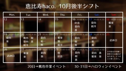 | 営業時間 | 20:00~翌5:00 ※コロナウイルスの影響で営業時間を変更しております。 2020/6/1〜 平日19:00〜25:30 土18:00〜25:30 日祝18:00〜23:30 | ||||||||||||||