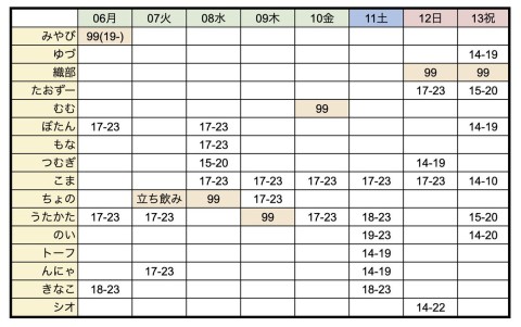 | 営業時間 | 18:00〜 | ||||||||||||||