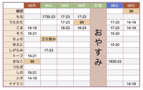 | 営業時間 | 18:00〜 | ||||||||||||||