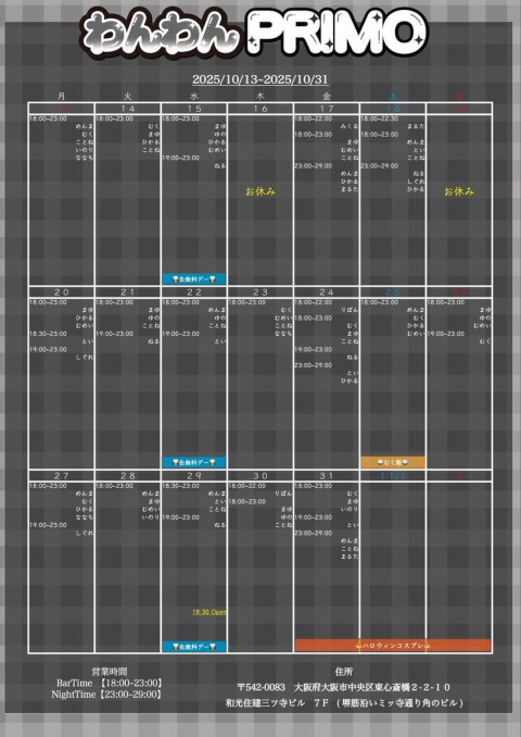 | 営業時間 | 月~日 18~23 金、土 23~29(不定期) | ||||||||||||||