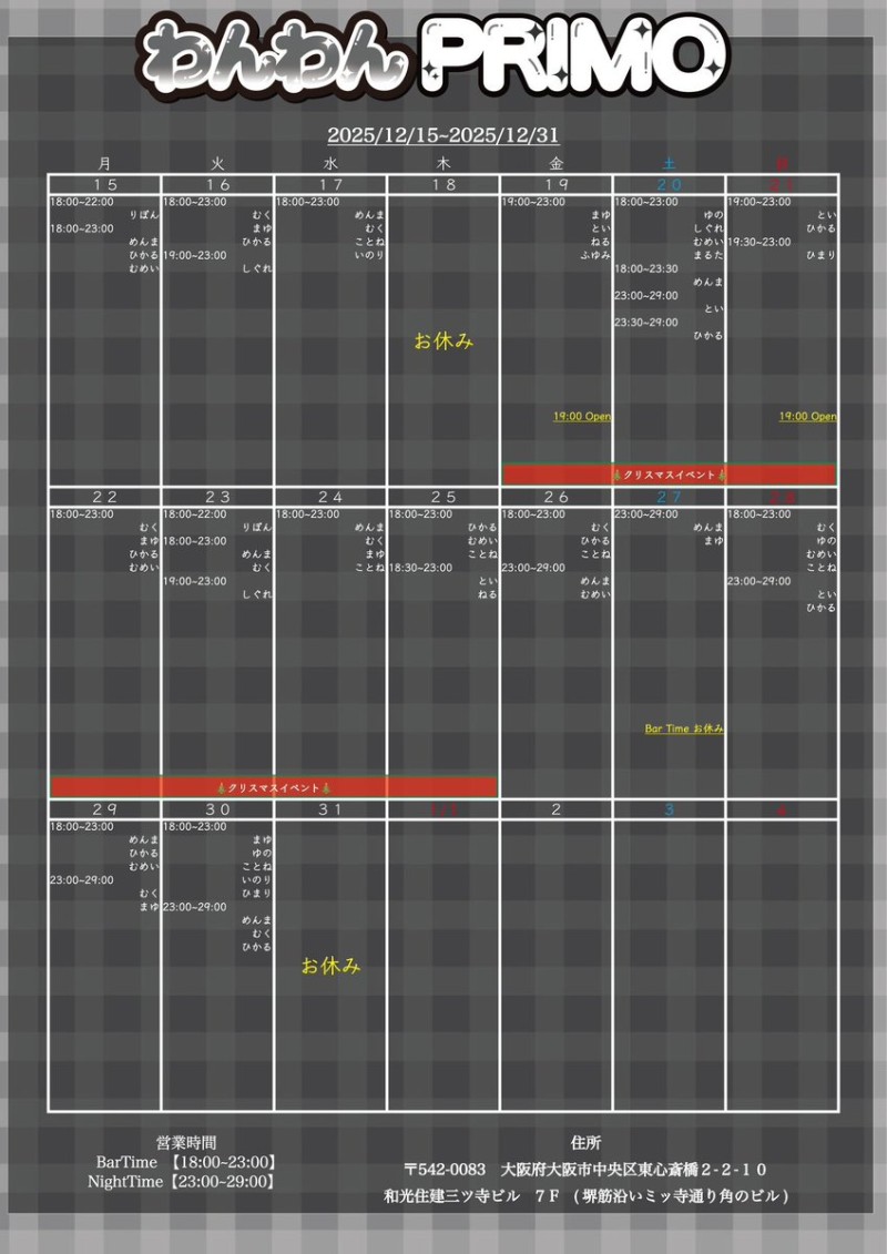 | 営業時間 | 月~日 18~23 金、土 23~29(不定期) | ||||||||||||||
