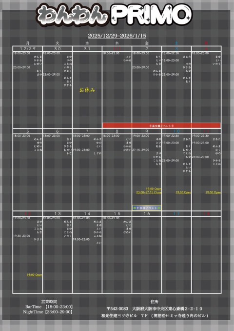 | 営業時間 | 月~日 18~23 金、土 23~29(不定期) | ||||||||||||||