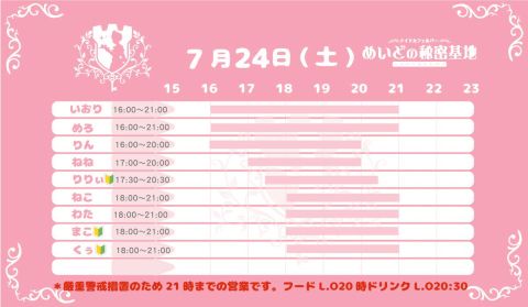 | 営業時間 | *火曜日~金曜日*18:00~23:00 *土曜日、日曜日*16:00~23:00 *月曜日、木曜日*定休日 (イベントなどで営業時間が変わることがあります。) | ||||||||||||||