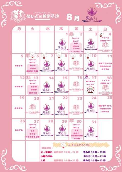 | 営業時間 | *火曜日~金曜日*18:00~23:00 *土曜日、日曜日*16:00~23:00 *月曜日、木曜日*定休日 (イベントなどで営業時間が変わることがあります。) | ||||||||||||||