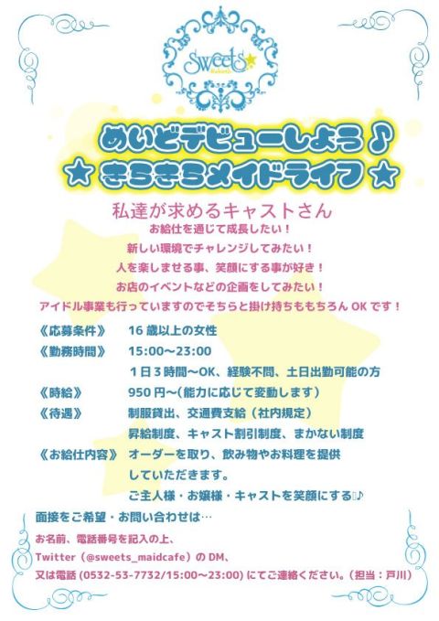 メイドカフェ スイーツでは一緒にお店を盛り上げてくれるメイドさんを募集してます! 姉妹店も近々リニューアルオープンの為沢山のご応募お待ちしてます。 アイドル、・イベントプロデュースもしておりますのでステージデビューも可https://t.co/whmZDfQgLc