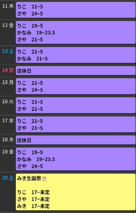4月11日〜20日までのシフトです👗 いよいよ20日、みき生誕祭です🎂 是非とも足をお運びくださいませ♪ https://t.co/8qIgShfffM