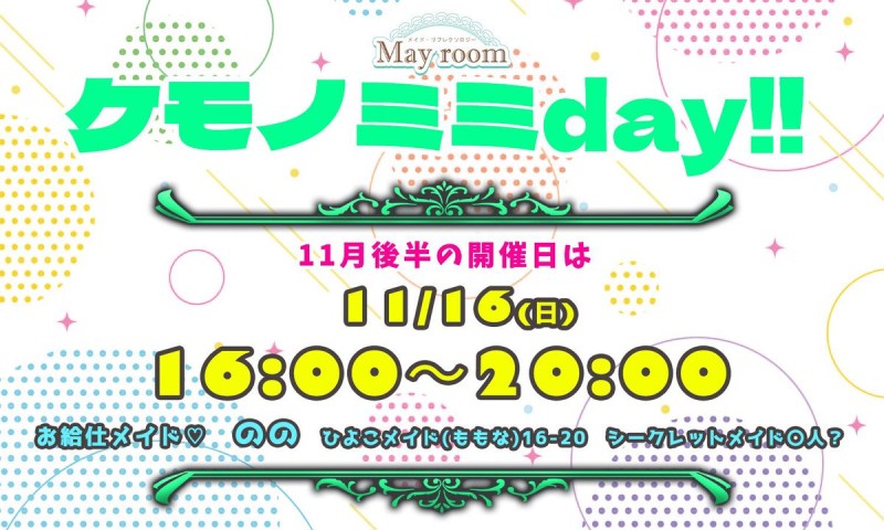 🐻‍❄ケモノミミdayのお知らせ🐻 11月埌半のケモノミミdayは、16日の日曜日開催です🐈 11月16日日1600〜2000 お絊仕メむド🐰のの16-20🐶ひよこメむド(🐣ももな)16-20🐹シヌクレットメむド〇人 メむドリフレク゜ロゞヌ May room -めいるヌむ- https://t.co/HTis7KjAjF https://t.co/598CMkC9RX