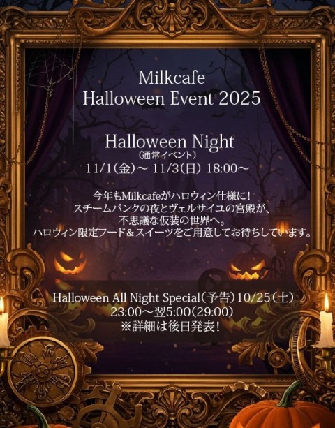 🎃 Milkcafe Halloween Event 2025🎃 🕯異なるふた぀のハロりィン🕯 👻 Halloween Night通垞むベント 📅 11/1金〜 11/3日 ⏰ 18:00〜 今幎もMilkcafeがハロりィン仕様に スチヌムパンクの倜ずノェルサむナの宮殿が、䞍思議な仮装の䞖界ぞ。 https://t.co/iBOMkEHnNH