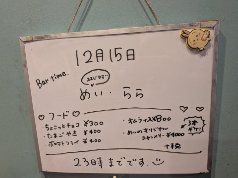 | 営業時間 | <平日> ●カフェタイム12:00〜18:00 ●バータイム18:00〜23:00 <土日祝> ●カフェタイム11:00〜18:00 ●バータイム18:00〜23:00 | ||||||||||||||