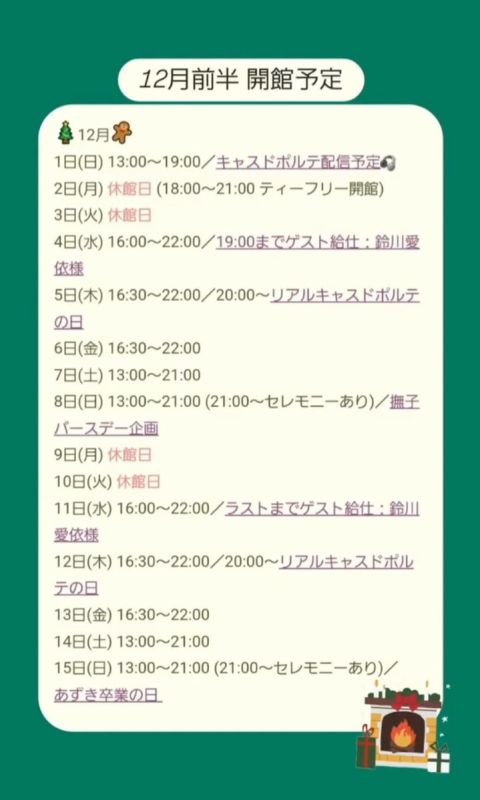 | å¶æ¥æé | æç« äŒé€šæ¥ïŒå¹³æ¥ 15:30ïœ22:00ïŒåæ 13:00ïœ21:00ïŒæ¥æ 13:00ïœ19:00 | ||||||||||||||