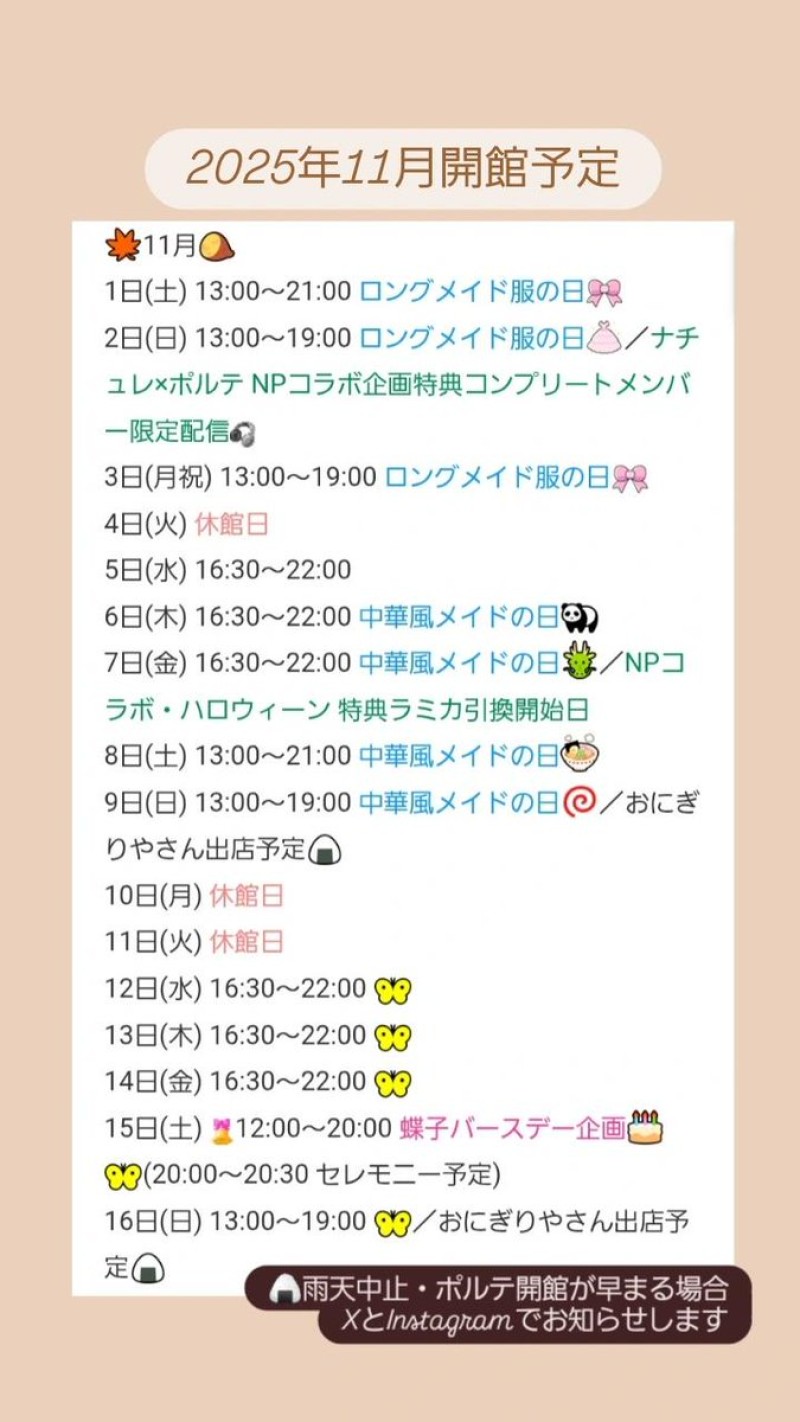 | å¶æ¥æé | æç« äŒé€šæ¥ïŒå¹³æ¥ 15:30ïœ22:00ïŒåæ 13:00ïœ21:00ïŒæ¥æ 13:00ïœ19:00 | ||||||||||||||