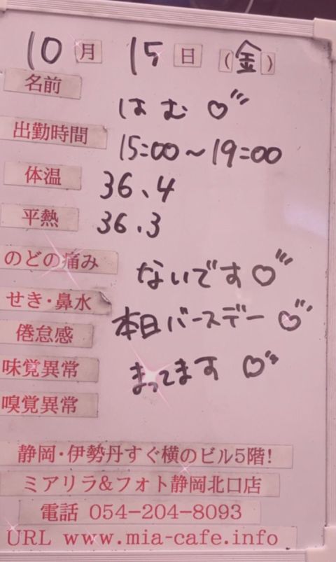 | 営業時間 | 静岡店は出勤スタッフがいれば営業です! 基本的に 12時~22時が営業時間です! ●静岡店のツイッター @shizuokamaidsan https://twitter.com/shizuokamaidsan ●ミア静岡店の営業曜日&営業時間● ☆月〜木 14:00〜22:00(最終受付20:00) ☆金曜日 12:00〜22:00(最終受付21:00) ☆土・日・祝 12:00〜22:00(最終受付21:00) 営業時間外はオンライン予約にてお願いいたします。 PC・携帯共通 → http://m-kanzume.moo.jp/yoyaku2/user.cgi ●ミアガイド出勤状況● スマホ・PC → 後日公開予定 ★静岡店スタッフによるミア甲府店でのメイドカフェリアル営業★ ☆不定期 サイトにてご確認ください。 http://market.chu.jp/schedule1/sche37.cgi | ||||||||||||||