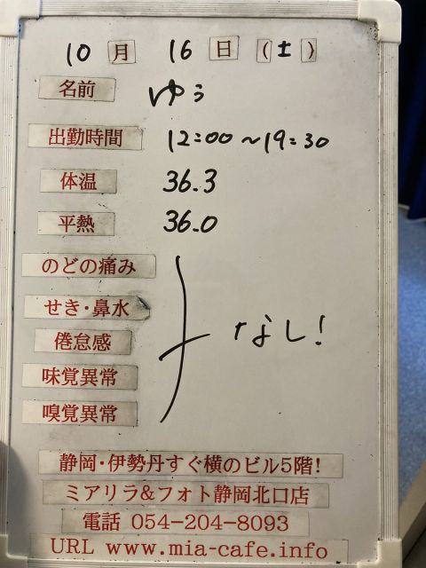 | 営業時間 | 静岡店は出勤スタッフがいれば営業です! 基本的に 12時~22時が営業時間です! ●静岡店のツイッター @shizuokamaidsan https://twitter.com/shizuokamaidsan ●ミア静岡店の営業曜日&営業時間● ☆月〜木 14:00〜22:00(最終受付20:00) ☆金曜日 12:00〜22:00(最終受付21:00) ☆土・日・祝 12:00〜22:00(最終受付21:00) 営業時間外はオンライン予約にてお願いいたします。 PC・携帯共通 → http://m-kanzume.moo.jp/yoyaku2/user.cgi ●ミアガイド出勤状況● スマホ・PC → 後日公開予定 ★静岡店スタッフによるミア甲府店でのメイドカフェリアル営業★ ☆不定期 サイトにてご確認ください。 http://market.chu.jp/schedule1/sche37.cgi | ||||||||||||||