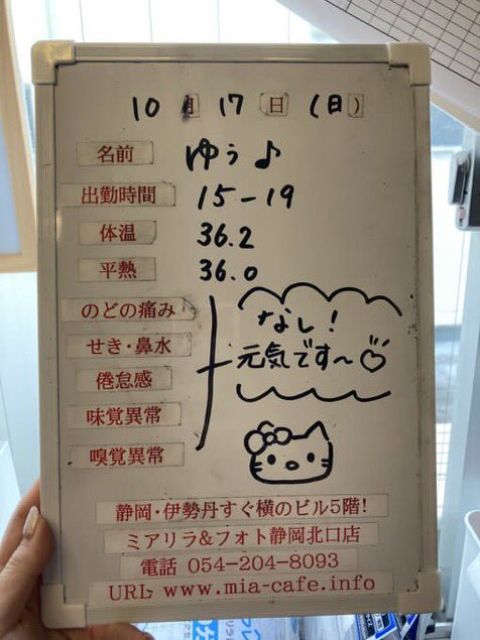 | 営業時間 | 静岡店は出勤スタッフがいれば営業です! 基本的に 12時~22時が営業時間です! ●静岡店のツイッター @shizuokamaidsan https://twitter.com/shizuokamaidsan ●ミア静岡店の営業曜日&営業時間● ☆月〜木 14:00〜22:00(最終受付20:00) ☆金曜日 12:00〜22:00(最終受付21:00) ☆土・日・祝 12:00〜22:00(最終受付21:00) 営業時間外はオンライン予約にてお願いいたします。 PC・携帯共通 → http://m-kanzume.moo.jp/yoyaku2/user.cgi ●ミアガイド出勤状況● スマホ・PC → 後日公開予定 ★静岡店スタッフによるミア甲府店でのメイドカフェリアル営業★ ☆不定期 サイトにてご確認ください。 http://market.chu.jp/schedule1/sche37.cgi | ||||||||||||||